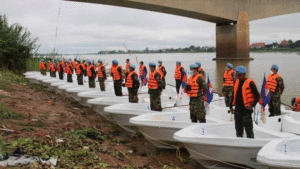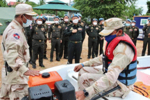 ភ្នំពេញ៖ សិក្ខាកាមទាហានមួកខៀវ នៃមជ្ឈមណ្ឌលជាតិរក្សាសន្តិភាពចំនួន៣៧នាក់ មុនចេញ ទៅបំពេញបេសកកម្មអង្គការសហប្រជាជាតិ នៅសាធារណរដ្ឋអាហ្វ្រិកកណ្តាលក្នុងឆ្នាំ ២០២២ ធ្វើការហ្វឹកហាត់រយៈពេល១ខែ លើជំនាញជួយសង្គ្រោះជនរងគ្រោះ ក្នុងហេតុការណ៍ គ្រោះមហន្តរាយទឹកជំនន់កើតឡើងដោយធម្មជាតិ ដោយយោធាចារ្យ ពីបញ្ជាការដ្ឋាន កងទ័ពជើងទឹក។