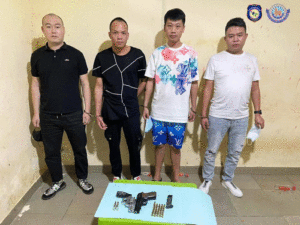 សូមបញ្ជាក់ថា កាលពីថ្ងៃទី០១ ខែកញ្ញា ឆ្នាំ២០២១ វេលាម៉ោង ២១:៣០នាទី មានជនជាតិចិន បានទូរស័ព្ទមករាយការណ៍តាមប្រព័ន្ធHotlineរបស់ស្នងការដ្ឋាននគរបាលខេត្តព្រះសីហនុ ថាមានជនជាតិចិនចំនួន០៤នាក់ ជិះរថយន្ត ០១គ្រឿង ម៉ាក Lexus GS300 ពណ៌ស ពាក់ស្លាកលេខ ភ្នំពេញ 2BF-7554 បានដកកាំភ្លើងខ្លីភ្ជង់គំរាមបាញ់មកលើរូបគាត់ បន្ទាប់ពីទទួលបានដំណឹងភ្លាម កម្លាំងការិយាល័យនគរបាលព្រហ្មទណ្ឌកម្រិតស្រាល បានសហការជាកម្លាំងអធិការនគរបាលក្រុងព្រះសីហនុ បានធ្វើការស្រាវជា្រវបង្ក្រាបបានជនសង្ស័យ ចំនួន ០៤នាក់ ជាជនជាតិចិន នៅចំណុចមុខហាងលក់ខោអាវ លីម ហុង ស្ថិតនៅភូមិ៣ សង្កាត់៤ ក្រុង-ខេត្តព្រះសីហនុ និងបានបង្កើតជាគណៈកម្មការត្រួតពិនិត្យរថយន្ត ក៏រកឃើញមានកាំភ្លើងខ្លីចំនួន០២ដើម ម៉ាក ROLO S&W.357 MAGNUM មានលេខសម្គាល់ E2VP13-21060106 គ្រាប់ចំនួន ០៦ គ្រាប់ និងម៉ាក CZ75 មានលេខសម្គាល់ 20-01216 ,គ្រាប់ចំនួន ៣១ គ្រាប់ ប្រភេទ9mm ក្នុងរថយន្តនៅកម្រាលជើងកៅអីផ្នែកខាងក្រោយ ។