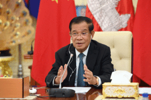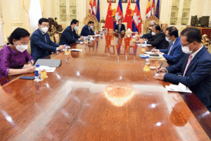 សម្តេចអគ្គមហាសេនាបតីតេជោ ហ៊ុន សែន នាយករដ្ឋមន្ត្រី នៃព្រះរាជាណាចក្រកម្ពុជា អញ្ជើញជួបសន្ទនាជាមួយ ឯកឧត្តម លី ខឺឈាង (Li Keqiang) នាយករដ្ឋមន្រ្តី នៃសាធារណរដ្ឋប្រជាមានិតចិន តាមរយៈប្រព័ន្ធវីដេអូ ពីភូមិគ្រឹះក្រុងតាខ្មៅ ខេត្តកណ្តាល នារសៀលថ្ងៃទី១៥ ខែវិច្ឆិកា ឆ្នាំ២០២១។