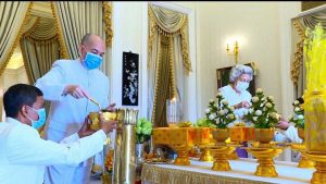 ព្រះករុណាជាអម្ចាស់ជីវិតលើត្បូង ព្រះបាទសម្ដេចព្រះបរមនាថ នរោត្តម សីហមុនី ព្រះមហាក្សត្រ នៃព្រះរាជាណាចក្រកម្ពុជា និងសម្ដេចព្រះមហាក្សត្រី នរោត្តម មុនិនាថ សីហនុ ព្រះវររាជមាតាជាតិខ្មែរ ក្នុងសេរីភាព សេចក្តីថ្លៃថ្នូរ និងសុភមង្គល ស្ដេចយាងបំពេញមហាព្រះរាជកុសលក្នុងព្រះរាជពិធីសិតទៀនវស្សាព្រះរាជទ្រព្យ នៅព្រះបរមរាជវាំង។