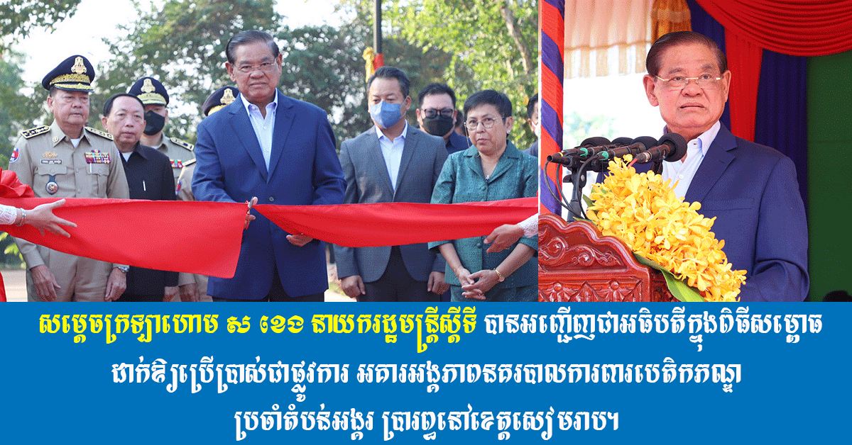 សម្ដេចក្រឡាហោម ស ខេង នាយករដ្ឋមន្ត្រីស្ដីទី បានអញ្ជើញជាអធិបតីក្នុងពិធីសម្ពោធដាក់ឲ្យប្រើប្រាស់ជាផ្លូវការ អគារអង្គភាពនគរបាលការពារបេតិកភណ្ឌប្រចាំតំបន់អង្គរ ប្រារព្ធនៅខេត្តសៀមរាប។
