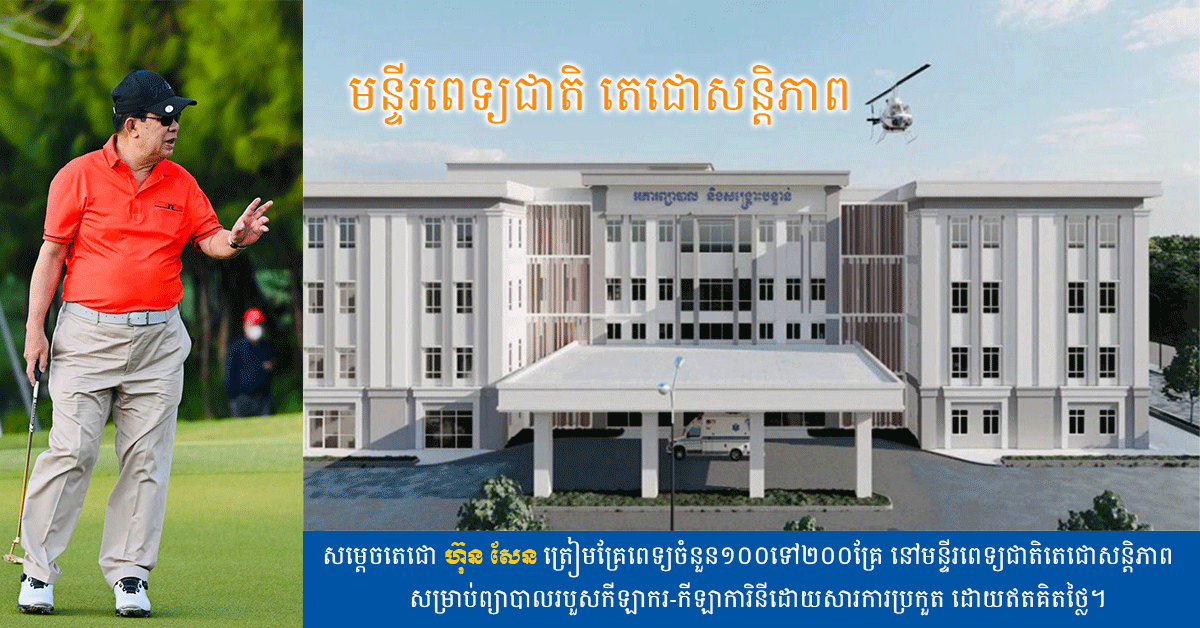 សម្តេចតេជោ ហ៊ុន សែន ត្រៀមគ្រែពេទ្យចំនួន ១០០ទៅ២០០គ្រែ នៅមន្ទីរពេទ្យជាតិតេជោសន្តិភាពសម្រាប់ព្យាបាលរបួសកីឡាករ-កីឡាការិនីដោយសារការប្រកួត ដោយឥតគិតថ្លៃ។