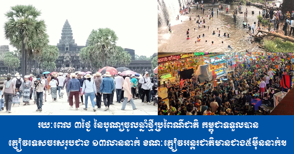 ក្រសួងទេសចរណ៍៖ រយៈពេល ៣ថ្ងៃ នៃបុណ្យចូលឆ្នាំថ្មីប្រពៃណីជាតិ កម្ពុជាទទួលបានភ្ញៀវទេសចរសរុបជាង ១៣លាននាក់ ខណៈភ្ញៀវអន្ដរជាតិមានជាង៥ម៉ឺននាក់។