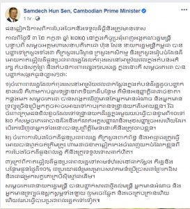 ប្រសាសន៍របស់សម្តេចអគ្គមហាសេនាបតីតេជោ ហ៊ុន សែន ដែលមានខ្លឹមសារដូចខាងក្រោម៖