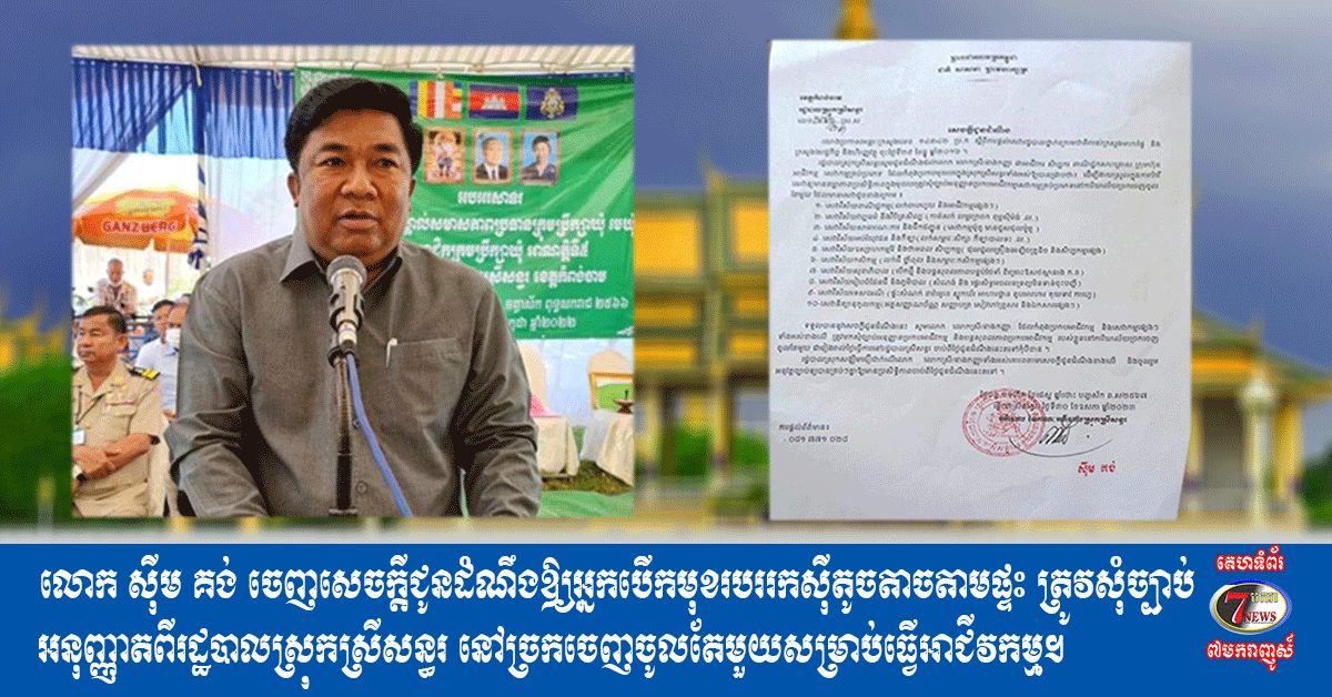 លោកស៊ីម គង់ ចេញសេចក្តីជូនដំណឹងឱ្យអ្នកបើកមុខរបររកស៊ីតូចតាចតាមផ្ទះ ត្រូវសុំច្បាប់អនុញ្ញាតពីរដ្ឋបាលស្រុកស្រីសន្ធរ នៅច្រកចេញចូលតែមួយសម្រាប់ធ្វើអាជីវកម្ម។