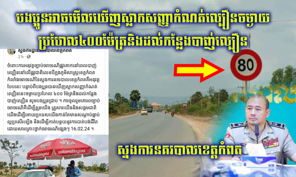 ខេត្តកំពត៖ នៅថ្ងៃទី១៦ ខែកុម្ភៈ ឆ្នាំ២០២៤ ចំពោះការអនុវត្តច្បាប់ចរាចរណ៏ផ្លូវគោកនៅពេលបាញ់ល្បឿននៅលើផ្លូវជាតិលេខ៣ក្នុងភូមិសាស្ត្រខេត្តកំពតកំលាំងចរាចរណ៏នៃស្នងការនគរបាលខេត្តកំពតគឺអនុវត្តបែបនេះ បន្ទាប់ពីបងប្អូនបានឃើញស្លាកសញ្ញាកំណត់ល្បឿននេះចម្ងាយប្រហែល ៤០០ ម៉ែត្រនិងដល់កន្លែងបាញ់ល្បឿន សូមបងប្អូនជ្រាប ។ ការចូលរួមគោរពច្បាប់ចរាចរណ៏គឺដើម្បីខ្លួនយើង គ្រួសារយើងនិងសង្គមជាតិយើងដើម្បីអោយប្រទេសយើងកាន់តែមានសណ្តាប់ធ្នាប់ល្អប្រសើរឡើង និងដើម្បីកាត់បន្ថយនូវការបាត់បង់ជីវិតដោយសារគ្រោះថ្នាក់ចរាចរណ៏ផ្សេងៗ ។