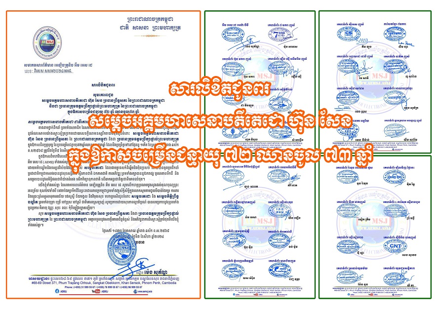 សារលិខិតជូនពរ សូមគោរពជូន សម្តេចអគ្គមហាសេនាបតីតេជោ ហ៊ុន សែន ក្នុងឱកាសចម្រើនជន្មាយុ ៧២ ឆ្នាំ ឈានចូល ៧៣ ឆ្នាំ។