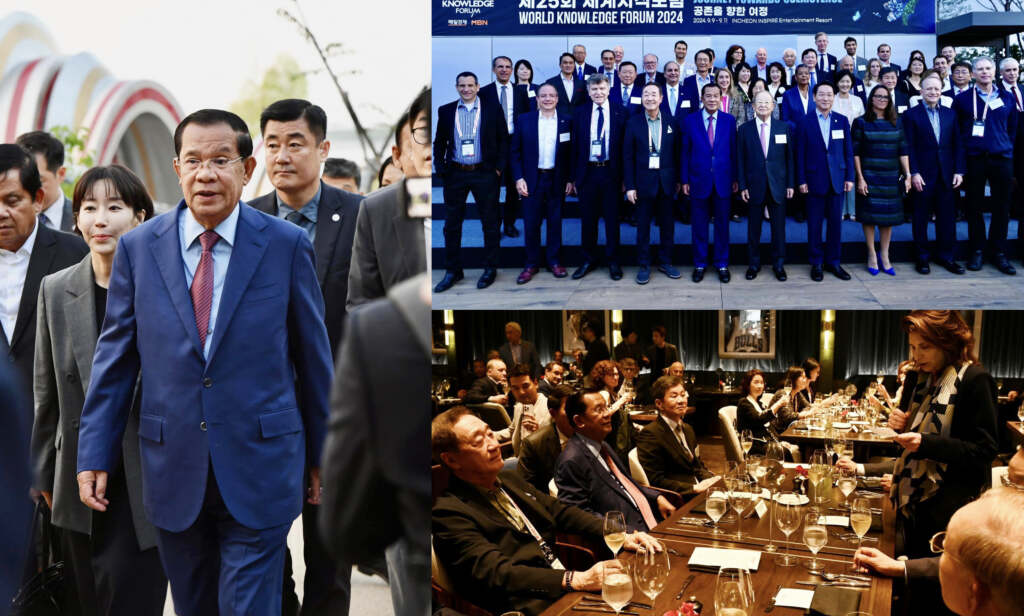 នៅទីក្រុងអ៊ីនឆន់ សាធារណរដ្ឋកូរ៉េ រាត្រីថ្ងៃទី៩ ខែកញ្ញា ឆ្នាំ២០២៤ សម្តេចអគ្គមហាសេនាបតីតេជោ ហ៊ុន សែន ប្រធានព្រឹទ្ធសភា នៃព្រះរាជាណាចក្រកម្ពុជា អញ្ជើញចូលរួមជាភ្ញៀវកិត្តិយសដ៏ខ្ពង់ខ្ពស់បំផុត ក្នុងពិធីជប់លៀងថ្នាក់ខ្ពស់ ដែលរៀបចំដោយវេទិកាចំណេះដឹងពិភពលោក (WKF) នាយកប្រតិបត្តិក្រុមហ៊ុន Maekyung និងអភិបាលក្រុងអ៊ីនឆន់ សាធារណរដ្ឋកូរ៉េ។ ពិធីដ៏មានអត្ថន័យនេះ មានការចូលរួមពីមជ្ឈដ្ឋានរដ្ឋាភិបាល អ្នកនយោបាយ អ្នកសិក្សាអប់រំ សាជីវកម្ម និងវិស័យផ្សេងៗ ជុំវិញពិភពលោក ក្នុងគោលបំណងចែករំលែកចំណេះដឹង ដើម្បីរួមចំណែកជំរុញកំណើនសេដ្ឋកិច្ច និងវិបុលភាពសកលប្រកបដោយតុល្យភាព។