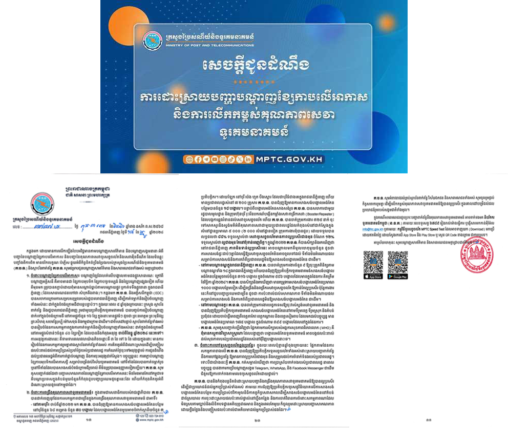 ក្រសួងប្រៃសណីយ៍ឆ្លើយតបនឹងការលើកទ្បើងបែបអវិជ្ជមានតាមបណ្តាញសារព័ត៌មាន និងបណ្តាញសង្គមអំពីបញ្ហានៃបណ្តាញខ្សែកាបលើអាកាស និងបញ្ហាគុណភាពសេវាទូរស័ព្ទចល័ត និងសេវាអ៊ីនធឺណិត។