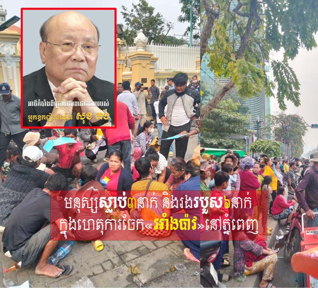 យ៉ាងហោចណាស់មានប្រជាពលរដ្ឋចំនួន បី នាក់ បានបាត់បង់អាយុជីវិត និង ប្រាំមួយ នាក់ផ្សេងទៀតបានទទួលរងរបួស ក្នុងហេតុការណ៍ជួបជុំ និងប្រជៀតគ្នានៅមុខផ្ទះអ្នកឧកញ៉ា សុខ គង់ ដើម្បីទទួលបានអាំងប៉ាវ។