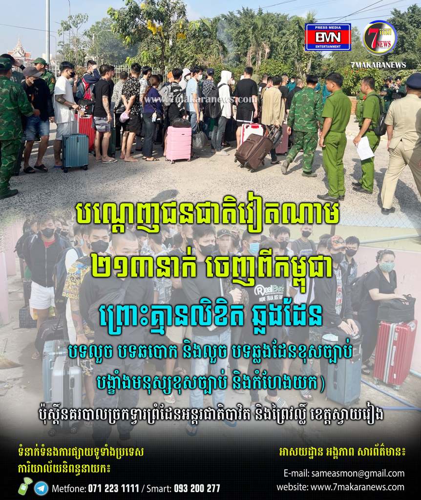 កម្ពុជាបណ្តេញជនជាតិវៀតណាម ២១៣នាក់ ចេញពីកម្ពុជា ពាក់ព័ន្ធករណីលួចស្នាក់នៅធ្វើការងារខុសច្បាប់ គ្មានលិខិត ឆ្លងដែន។