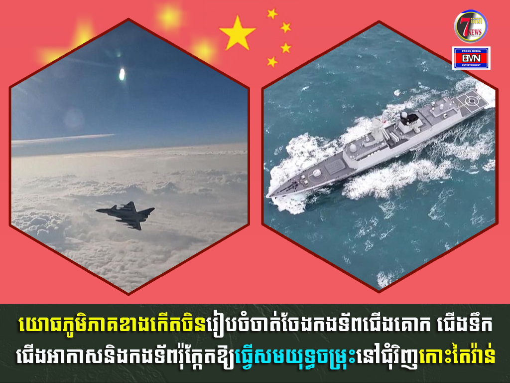 យោធភូមិភាគខាងកើតចិនរៀបចំចាត់ចែងកងទ័ពជើងគោក ជើងទឹក ជើងអាកាសនិងកងទ័ពរ៉ុក្កែតឱ្យធ្វើសមយុទ្ធចម្រុះនៅជុំវិញកោះតៃវ៉ាន់