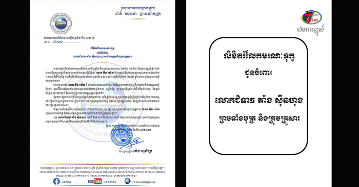 លិខិតរំលែកមរណៈទុក្ខ ជូនចំពោះ លោកជំទាវ តាំង ស៊ីនហុង ព្រមទាំងបុត្រ និងក្រុមគ្រួសារ