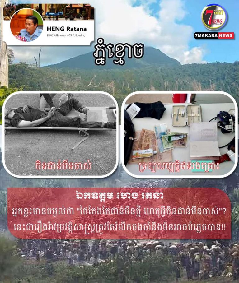 ឯកឧត្តម ហេង រតនា ប្រតិភូរាជរដ្ឋាភិបាលទទួលបន្ទុកជាអគ្គនាយកស៊ីម៉ាក់បានបញ្ជាក់តាមបណ្តាញសង្គមហ្វេសបុកផេក(Facebook Page)របស់លោកថា៖ បញ្ហាផ្ទុះគ្រាប់មីនប្រឆាំងមនុស្សរបួសដាច់ជើងម្ខាងនិងរងរបួសដៃព្រមទាំងផ្ទៃមុខ ជនជាតិចិនម្នាក់ភេទប្រុស វេលាម៉ោងប្រមាណ៣:២០នាទីព្រឹកទៀបភ្លឺ នៅថ្ងៃទី២៩ ខែវិច្ឆិកា ឆ្នាំ២០២៥ នៅភូមិសាស្រ្តចម្ការមីនកម្ពុជាលេខBS:22575 ក្បែរបង្គោលសីមាលេខ៤៨ ស្ថិតនៅភូមិជោគជ័យ ឃុំអូរបីជាន់ ស្រុកអូរជ្រៅ ខេត្តបន្ទាយមានជ័យ។ ក្រោយឧបទ្ទវហេតុគ្រោះថ្នាក់ផ្ទុះមីនជនជាតិចិនម្នាក់នេះភ្លាម ខាងភាគីថៃបានបំពងសំឡេងវាយប្រហារលាបពណ៌កម្ពុជាថា ជនជាតិចិនលួចឆ្លងដែនពីកម្ពុជាទៅថៃ...