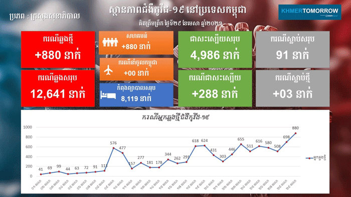 ភ្នំពេញ៖ ចេញផ្សាយ ថ្ងៃព្រហស្បតិ៍ ៣រោច ខែពិសាខ ឆ្នាំឆ្លូវ ត្រីស័ក ព.ស ២៥៦៥, ត្រូវនឹងថ្ងៃទី ២៩ ខែ មេសា ឆ្នាំ២០២១។ ភ្នំពេញ៖ សង្ខេបព័ត៌មានស្តីពីការរកឃើញអ្នកឆ្លងថ្មីរបស់វីរុសកូវីដ១៩នៅកម្ពុជា ថ្ងៃទី២៨ ខែមេសា ឆ្នាំ២០២១ រកឃើញអ្នកឆ្លងថ្មី...