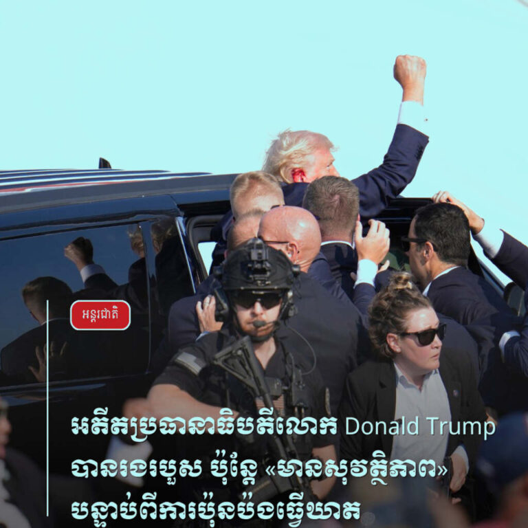 អតីតប្រធានាធិបតីលោក Donald Trump បានរងរបួសក្បាលកាលពីថ្ងៃសៅរ៍ ប៉ុន្តែ លោក«មិនអីទេ»។ នេះបើយោងតាមក្រុមយុទ្ធនាការរបស់លោក បន្ទាប់ពីមានការបាញ់ប្រហារក្នុងទិសដៅរបស់លោកនៅឯការប្រមូលផ្តុំយុទ្ធនាការឃោសនាមួយក្នុងរដ្ឋ Pennsylvania ។ នៅក្នុងសេចក្តីថ្លែងការណ៍មួយ ក្រុមយុទ្ធនាការរបស់លោក Trump បាននិយាយថា បេក្ខជនប្រធានាធិបតីមកពីគណបក្សសាធារណរដ្ឋ បានទទួលការព្យាបាលនៅឯមន្ទីរពេទ្យក្នុងមូលដ្ឋានមួយ។ លោកបានទៅទីក្រុង Butler ក្នុងរដ្ឋដែលមានការប្រកួតប្រជែងខ្លាំងដើម្បីធ្វើការឃោសនា។ លោក...
