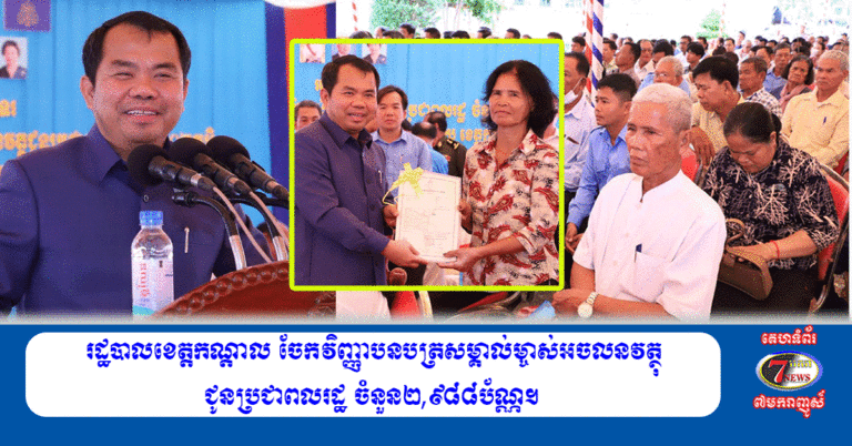 រដ្ឋបាលខេត្តកណ្ដាល ចែកវិញ្ញាបនបត្រសម្គាល់ម្ចាស់អចលនវត្ថុ ជូនប្រជាពលរដ្ឋ ចំនួន២,៩៨៨ប័ណ្ណ ខេត្តកណ្តាល ៖ ឯកឧត្ដម គង់ សោភ័ណ្ឌ អភិបាល នៃគណៈអភិបាលខេត្តកណ្ដាល សំដែងនូវការអបអរសាទរ ជាមួយ បងប្អូនប្រជាពលរដ្ឋ ក្នុងភូមិខ្សុំ និងភូមិអង្គរជ័យ ឃុំបន្ទាយដែក ស្រុកកៀនស្វាយ ដែលទទួលបាននូវវិញ្ញាបនបត្រ សម្គាល់ម្ចាស់អចលនវត្ថុ...