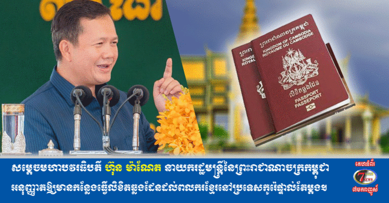 សម្តេចធិបតី ហ៊ុន ម៉ាណែត នាយករដ្ឋមន្រ្ដី អនុញ្ញាតឱ្យមានកន្លែងធ្វើលិខិតឆ្លងដែនដល់ពលករខ្មែរនៅប្រទេសកូរ៉េផ្ទាល់តែម្តង។ កំពង់ស្ពឺ៖ សម្តេចមហាបវរធិបតី ហ៊ុន ម៉ាណែត នាយករដ្ឋមន្ត្រីនៃព្រះរាជាណាចក្រកម្ពុជាបានសម្រេចអនុញ្ញាតឱ្យរៀបចំធ្វើលិខិតឆ្លងដែន នៅក្រៅប្រទេសតែម្ដង ដោយចាប់ផ្ដើមពីប្រទេសកូរ៉េ តែម្ដង ដើម្បីកុំឱ្យបងប្អូនមាន ការលំបាកក្នុងការធ្វើលិខិតឆ្លងដែន។ សម្តេចធិបតីបានបញ្ជាក់ថា បងប្អូនខ្មែរយើងដែលធ្វើការនៅក្រៅប្រទេស ពិសេសនិយាយ ពីប្រទេសកូរ៉េ សូមឱ្យឯកអគ្គរាជទូតប្រចាំនៅប្រទេសកូរ៉េ...