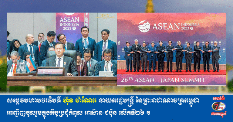 សម្ដេចមហាបវរធិបតី ហ៊ុន ម៉ាណែត នាយករដ្ឋមន្ត្រី នៃព្រះរាជាណាចក្រកម្ពុជា អញ្ជើញចូលរួមក្នុងកិច្ចប្រជុំកំពូល អាស៊ាន-ជប៉ុន លើកទី២៦ នៅព្រឹកថ្ងៃទី៦ ខែកញ្ញា ឆ្នាំ ២០២៣ នេះ ក្នុងឱកាសអញ្ជើញចូលរួមក្នុងកិច្ចប្រជុំកំពូលអាស៊ានលើកទី៤៣ និងកិច្ចប្រជុំពាក់ព័ន្ធ នៅប្រទេសឥណ្ឌូនេស៊ី សម្ដេចមហាបវរធិបតី ហ៊ុន ម៉ាណែត នាយករដ្ឋមន្ត្រី...