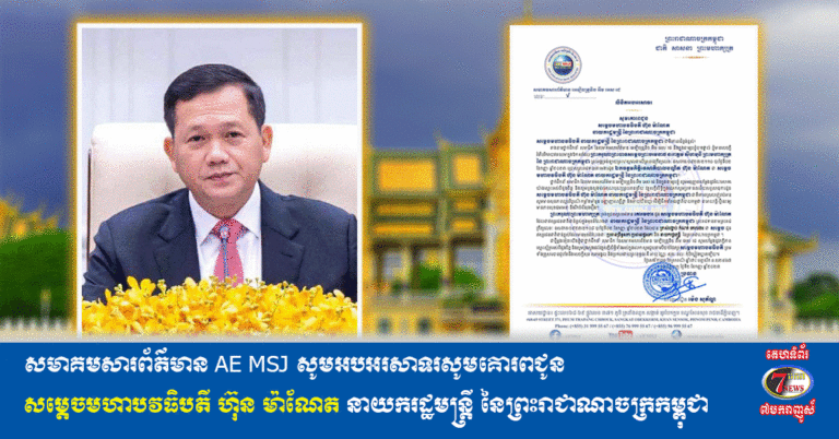 សមាគមសារព័ត៌មាន AE MSJ សូមអបអរសាទរសូមគោរពជូនសម្តេចមហាបវធិបតី ហ៊ុន ម៉ាណែត នាយករដ្ឋមន្រ្តី នៃព្រះរាជាណាចក្រកម្ពុជា។