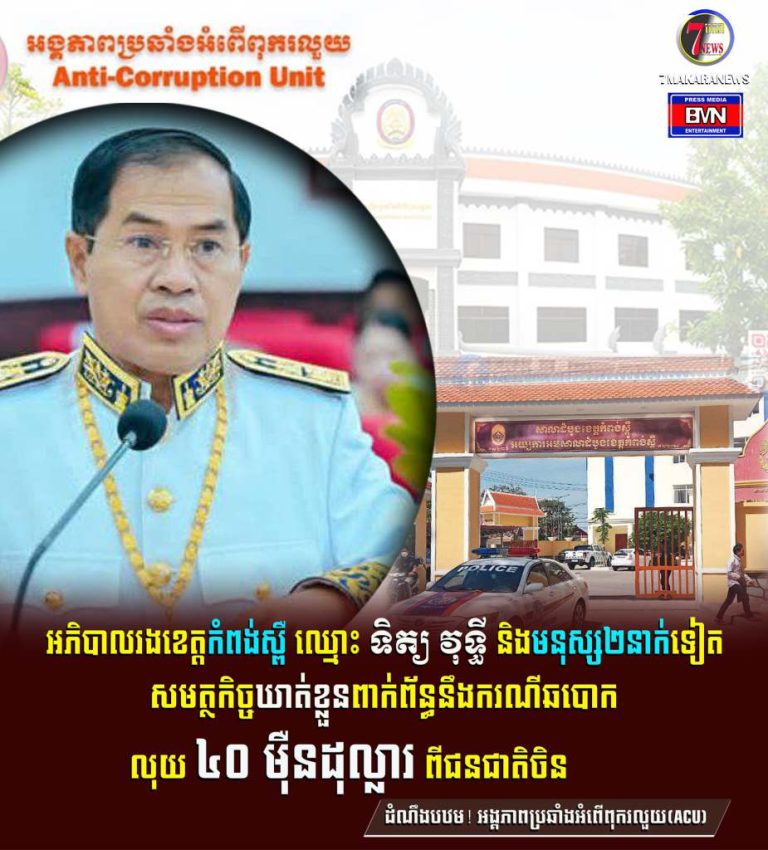 ដំណឹងបឋម! -អង្គភាពប្រឆាំងអំពើពុករលួយ(ACU) បានឃាត់ខ្លួនអភិបាលរងខេត្តកំពង់ស្ពឺម្នាក់ ឈ្មោះ ទិត្យ វុទ្ធី និងមនុស្ស២នាក់ទៀត បញ្ជូនមកកាន់អយ្យការសាលាដំបូងខេត្តកំពង់ស្ពឺ ដើម្បីសួរនាំ នៅព្រឹកថ្ងៃទី១០ ខែមីនា ឆ្នាំ២០២៥។ ការឃាត់ខ្លួននេះ ពាក់ព័ន្ធនឹងករណីឆបោកលុយ ៤០ (សែសឹបម៉ឺនដុល្លារសហរដ្ឋអាមេរិក) ពីជនជាតិចិន រឿងវិនិយោគថ្មម៉ាបលើគម្រោងទឹកប្រាក់ ៨០ (ប៉ែតសឹបម៉ឺនដុល្លារសហរដ្ឋអាមេរិក)...