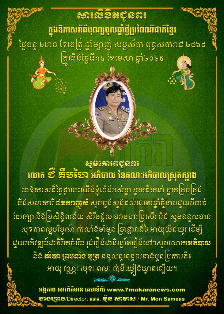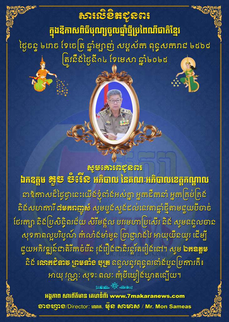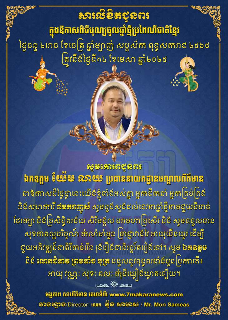 ក្នុងឱកាសពិធីបុណ្យចូលឆ្នាំថ្មីប្រពៃណីជាតិខ្មែរ ថ្ងៃចន្ទ ២រោច ខែចេត្រ ឆ្នាំម្សាញ់ សប្តស័ក ពុទ្ធសករាជ ២៥៦៨ ត្រូវនឹងថ្ងៃទី១៤ ខែមេសា ឆ្នាំ២០២៥។ អ្នកដឹកនាំ អ្នកគ្រប់គ្រង រួមទាំងសហការី នៃអង្គភាព សារព័រមាន គេហទំព័រ ៧មករាញូស៍ សូមគោរពជូនពរ លោកបណ្ឌិត...