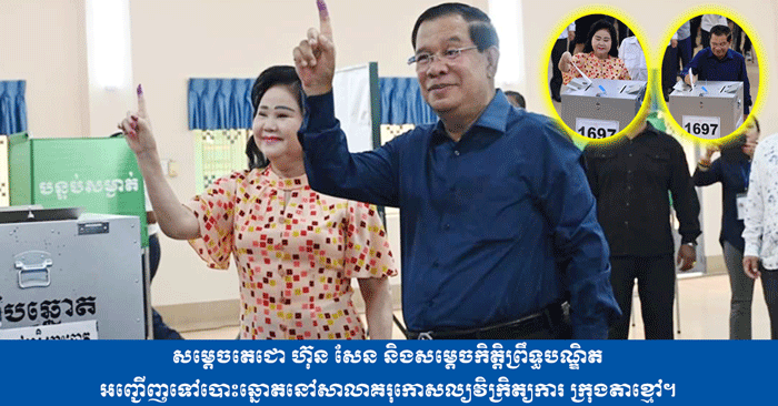 សម្តេចតេជោ ហ៊ុន សែន និងសម្តេចកិត្តិព្រឹទ្ធបណ្ឌិត អញ្ជើញទៅបោះឆ្នោតនៅសាលាគរុកោសល្យវិក្រិត្យការ ក្រុងតាខ្មៅ។ កណ្តាល៖ នៅព្រឹកថ្ងៃទី២៣ ខែកក្កដាឆ្នាំ២០២៣ សម្តេចអគ្គមហាសេនាបតីតេជោ ហ៊ុន សែន នាយករដ្ឋមន្រ្តី នៃព្រះរាជាណាចក្រកម្ពុជា និងសម្តេចកិត្តិព្រឹទ្ធបណ្ឌិត ប៊ុន រ៉ានី ហ៊ុន សែន អញ្ជើញទៅបោះឆ្នោតជ្រើសតាំងតំណាងរាស្ត្រនីតិកាលទី៧...