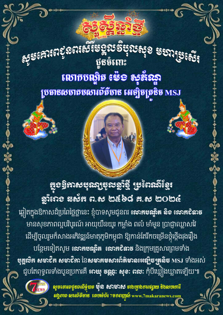 សូមគោរពជូនពរ សិរីមង្គល វិបុលសុខ មហាប្រសើរ ជូនចំពោះ លោកបណ្ឌិត ម៉េង សុភ័ណ្ឌ ប្រធានសមាគមសារព័ត៌មាន អេឡិចត្រូនិច អឹម អេស ជេ(MSJ) និងលោក ជំទាវ ព្រមទាំងក្រុមគ្រួសារ និងសហការី ក្នុងឱកាសបុណ្យចូលឆ្នាំថ្មីប្រពៃណីខ្មែរ ឆ្នាំរោង ឆស័ក...