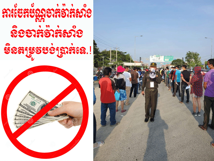 ភ្នំពេញ៖ ចេញផ្សាយ ថ្ងៃច័ន្ទ ៧រោច ខែពិសាខ ឆ្នាំឆ្លូវ ត្រីស័ក ព.ស ២៥៦៥, ត្រូវនឹងថ្ងៃទី ៣ ខែ ឧសភា ឆ្នាំ២០២១។ សូមជម្រាបជូនបងប្អូនប្រជាពលរដ្ឋមេត្តាជ្រាប ការចែកប័ណ្ណចាក់វ៉ាក់សាំង និងចាក់វ៉ាក់សាំងពុំតម្រូវបង់ប្រាក់ទេ ក្នុងករណីមានជនខិលខូចតម្រូវឲ្យបង់ប្រាក់សូមរាយការណ៍មកក្រុមការងារសម្របសម្រួលចាក់វ៉ាក់សាំងដែលនៅតាមទីតាំងឃុំសង្កាត់ ខណ្ឌ និងអាជ្ញាធរមូលដ្ឋានជាបន្ទាន់។