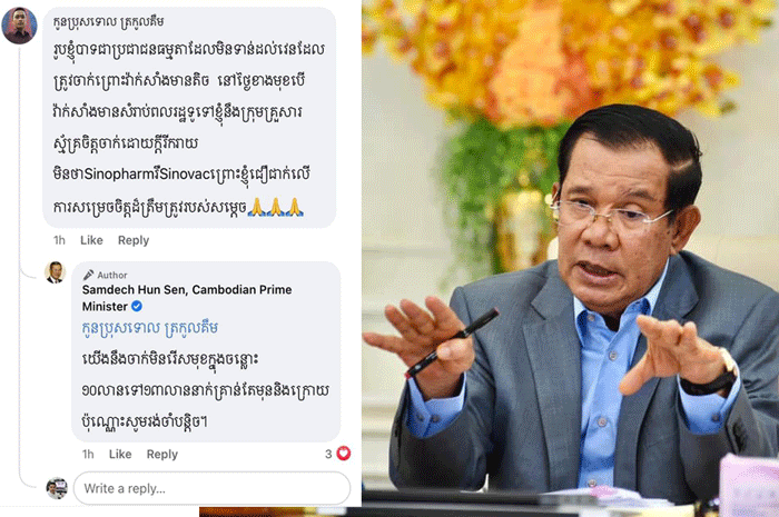 ភ្នំពេញ៖ ចេញផ្សាយ ថ្ងៃច័ន្ទ ៧រោច ខែពិសាខ ឆ្នាំឆ្លូវ ត្រីស័ក ព.ស ២៥៦៥, ត្រូវនឹងថ្ងៃទី ៣ ខែ ឧសភា ឆ្នាំ២០២១។ សម្ដេចអគ្គមហាសេនាបតីតេជោ ហ៊ុន សែន៖ «យើងនឹងចាក់មិនរើសមុខក្នុងចន្លោះ១០លាន ទៅ១៣លាននាក់ គ្រាន់តែមុន...
