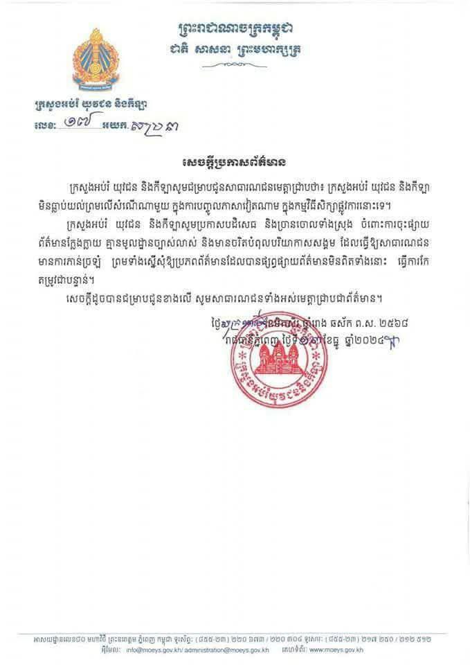 រាជធានីភ្នំពេញ៖ ថ្ងៃទី១៣ ខែធ្នូ ឆ្នាំ២០២៤- សេចក្តីប្រកាសព័ត៌មាន៖ ក្រសួងអប់រំ យុវជន និងកីឡាសូមជម្រាបជូនសាធារណជនមេត្តាជ្រាបថា៖ ក្រសួងអប់រំ យុវជន និងកីឡា មិនធ្លាប់ យល់ព្រមលើសំណើណាមួយ ក្នុងការបញ្ចូល ភាសាវៀតណាម ក្នុងកម្មវិធីសិក្សាផ្លូវការ នោះទេ។ ក្រសួងអប់រំ យុវជន...
